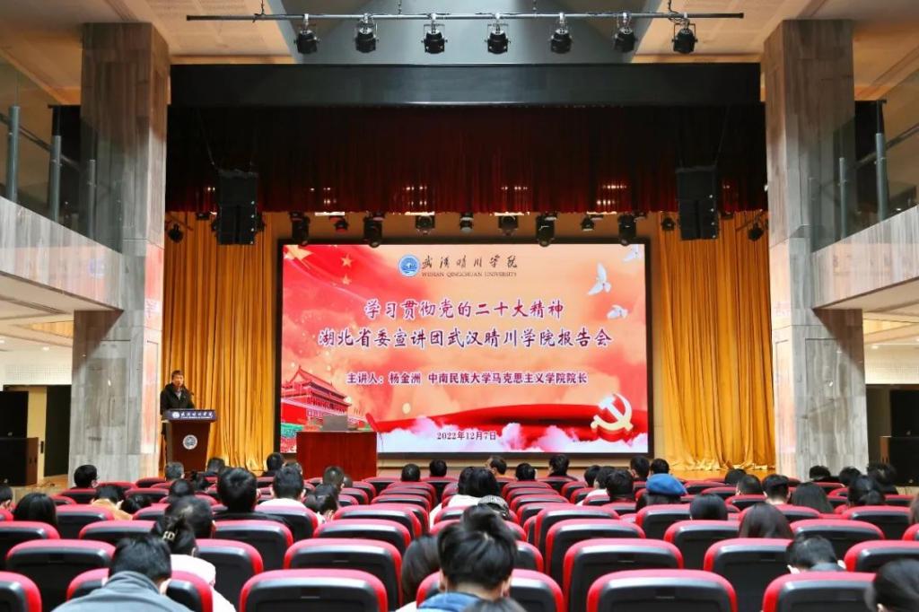 12月7日,学习贯彻党的二十大精神湖北省委宣讲团报告会在威廉希尔中文官网举行。董事长、校长汪彬教授出席报告会。省委宣讲团成员、中南民族大学马克思主义学院院长杨金洲以《高举旗帜、踔厉奋发 为全面建设社会主义现代化国家而努力》为题作宣讲报告。威廉希尔中文官网党委书记翟细春主持报告会。