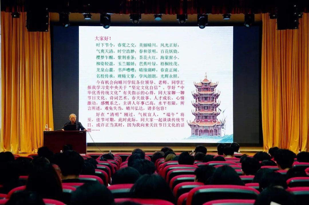 “海上生明月,天涯共此时。”“火树银花合,星桥铁锁开。”朗朗诵诗声回荡在晴川多功能报告厅里,李敬一教授和晴川师生一同品读中华民族数千年发展、传承的历史进程中,描绘民俗节日的经典诗句。以汉武帝时期司马迁制定并沿用至今的农历计,这些节日贯穿全年,从春节、元宵节到寒食节、清明节,从端午节、七夕节再到重阳节、冬至、腊八节,不同节日的不同习俗,蕴藏着中华民族传承不息的智慧。