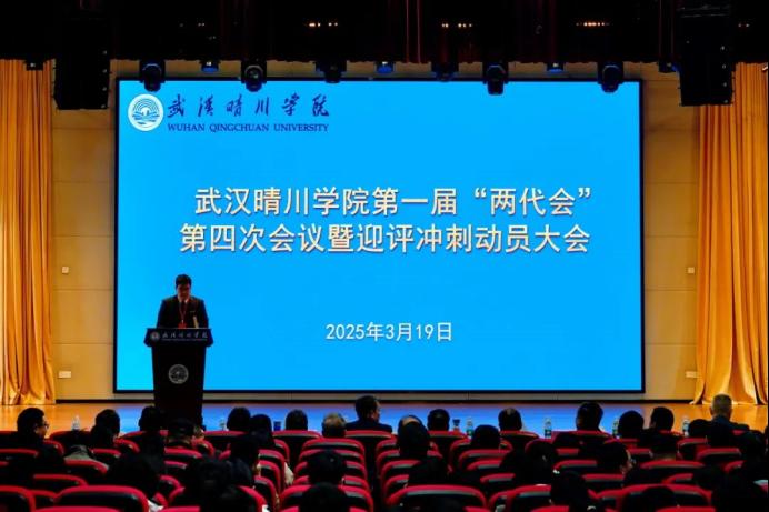 董事长、校长汪彬教授向大会作了题为《众志成城 全力冲刺合格评估“攻坚战”》的动员讲话,向全体晴川人发出“三最”动员令,吹响学校迎评冲刺的冲锋号,号召全体晴川人以团结奋斗的磅礴合力,在“迎评促建大考”中交出满意的答卷。他指出,从建校时的筚路蓝缕到转设时的破茧成蝶,从评建初期的热火朝天到如今的满园春色,充分体现了晴川人克难奋进的精神底色和追求卓越的志向抱负!迎评大考在即,要树立必胜信心,凝聚决胜合力,坚守“办好人民满意的教育”初心使命,在明体达用、体用贯通的“三有三能”应用型人才培养实践中开拓进取,做到思想同心、目标同向、行动同步。