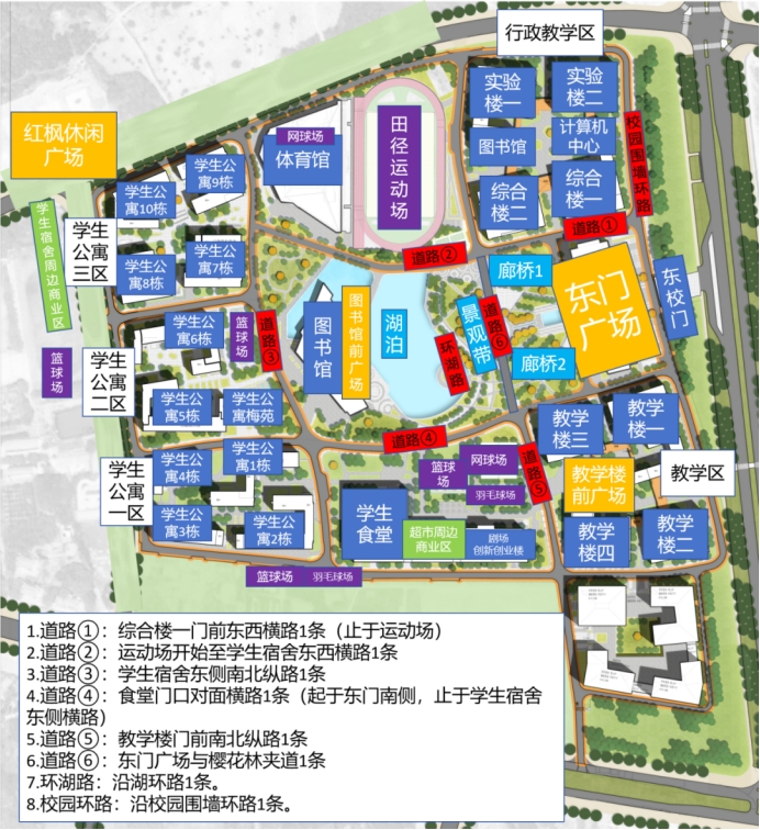 1、学校道路命名:综合楼一门前东西横路1条(止于运动场),运动场开始至学生宿舍东西横路1条,学生宿舍东侧南北纵路1条,食堂门口对面横路1条(起于东门南侧,止于学生宿舍东侧横路),教学楼门前南北纵路1条,东门广场与樱花林夹道1条,环湖路1条,沿校园围墙环路1条。
