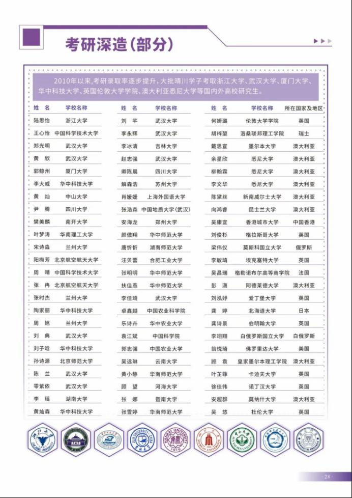 升学就业捷报频传。在晴川,勤耕力学的榜样无处不在。近年来,该校考研上岸“双一流”大学、海外名校留学深造、考公考编人数屡创新高,耶鲁大学、悉尼大学、莫斯科大学、浙大、武大、华科大、南开等名校录取名单年年刷新,一批晴川学子签约国家机关、事业单位和知名企业。涌现出了以罗将(杭州电子科技大学副教授)、乐雄平(武汉纺织大学讲师)为代表的教育新星;以王佳权(中科院)、王东晖(国家电网)、马杰康(中船重工)为代表的青年科技人才;以刘芷君(深圳海关)、乐彤(中国人民银行)、李丽娜(中国烟草总公司)、方奇(阿里巴巴)、李琴(小米总部)为代表的业界精英;以张航、司马经礼、周强为代表的扎根基层、建功立业的人民勤务员等。