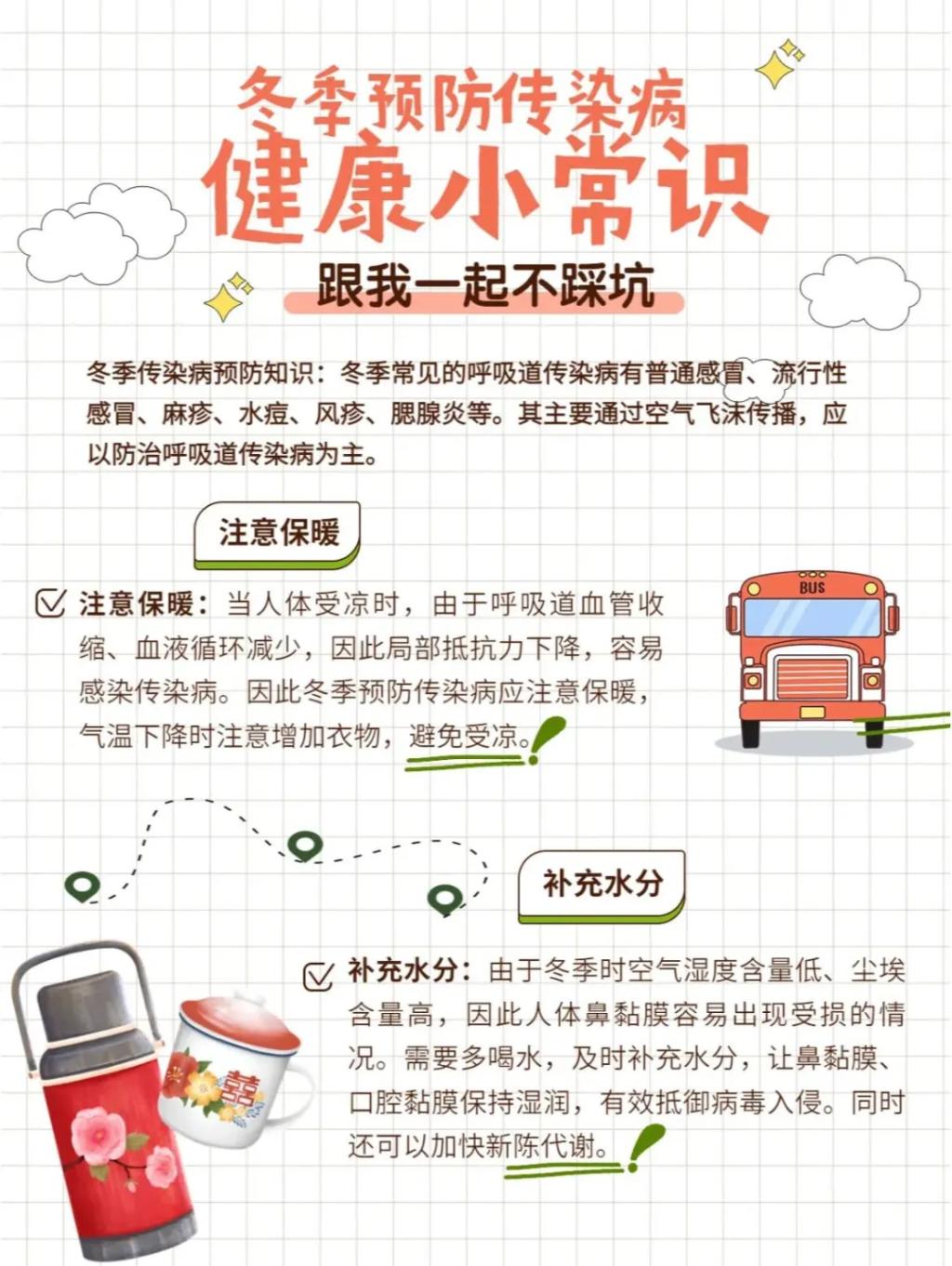 1.做好个人卫生防护。自觉践行“健康第一”理念,当好自身健康第一责任人。坚持良好卫生习惯,防范冬季各类呼吸道疾病,保持健康生活方式,提升健康素养和自我防护能力。回家及返校途中注意个人卫生,做好旅途防护。