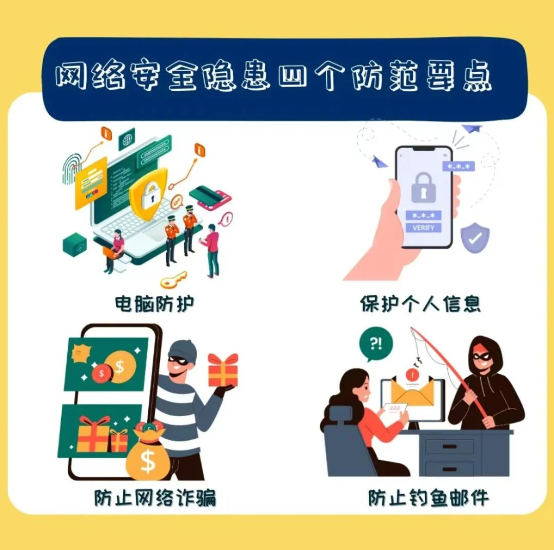 3.提升网络安全意识。不沉迷网络和电子游戏,对不熟悉的网络游戏、直播、QQ群、微信群、贴吧不接触不参与;理性表达观点,不造谣不信谣不传谣;增强金融风险防范意识,不参与网络不良借贷。警惕各类电信网络诈骗,不点击未知链接,不轻信陌生来电,不透漏个人信息,遇到转账汇款要多核实,发现有问题及时报警。