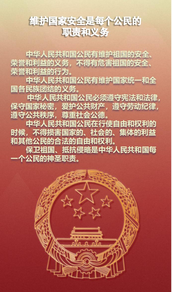 宪法是国家的根本大法,具有最高的法律地位、法律权威、法律效力。国家安全是安邦定国的重要基石、治国理政的头等大事,维护国家安全是全国人民根本利益所在。宪法为维护国家安全提供了根本法律遵循,是国家安全法律法规的总依据、总源头。拥护宪法权威,维护国家安全,是每位公民义不容辞的责任。